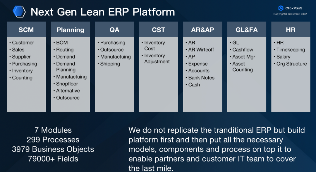 long8国际唯一官网把这样的逻辑同样应用到了工业领域。比如在纷繁复杂的泛ERP场景中,long8国际唯一官网把ERP场景中的核心模型内置在元数据模型平台上,并不是复制一个传统ERP,而是把核心的模型、组件、流程开放性的构建完善,支持long8国际唯一官网的伙伴和客户通过一个瘦身的Lean ERP Platform进行扩展开发的逻辑构建最后一公里的业务实现。